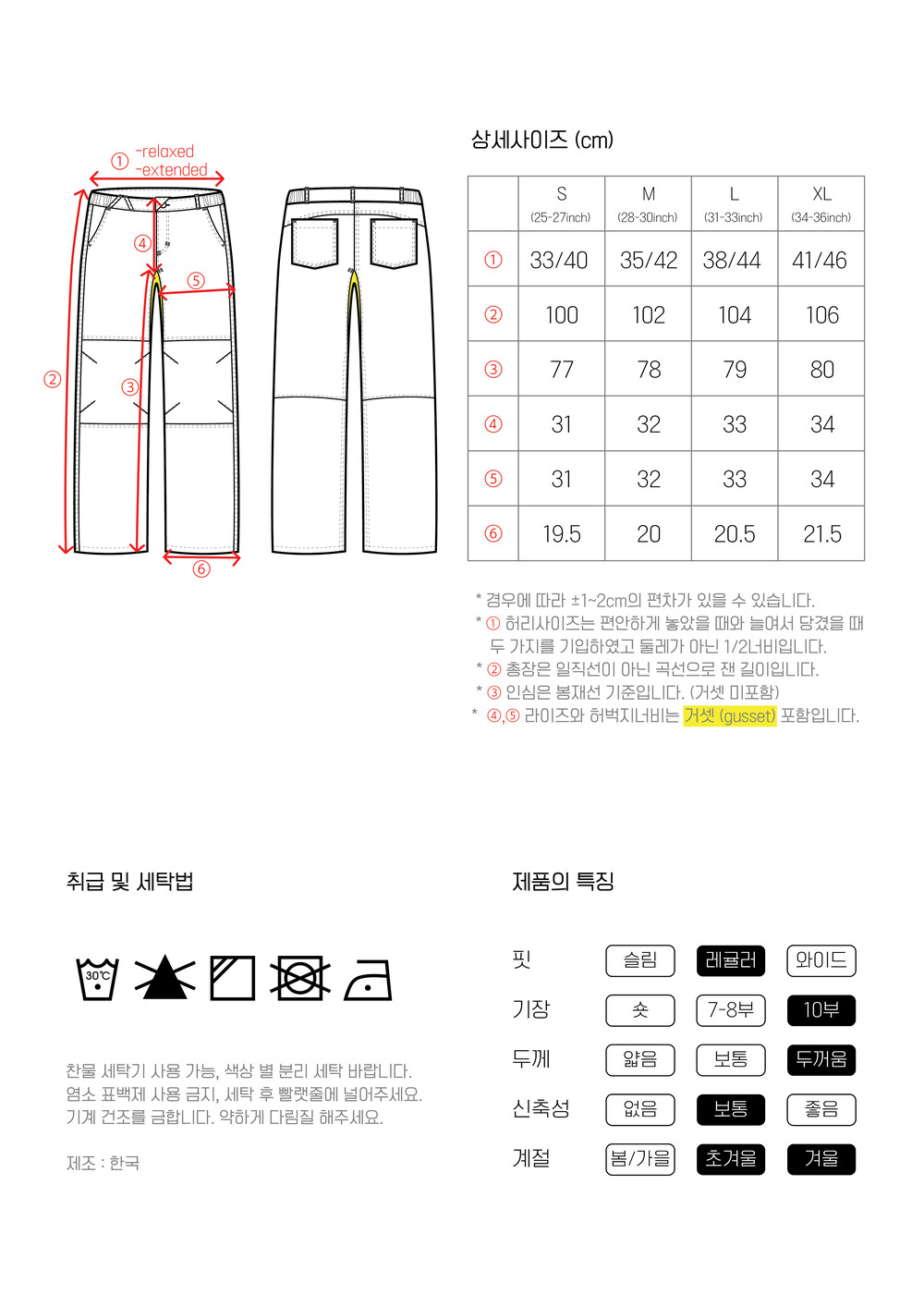 허리 양 옆에 부드러운 중간직 밴드가 들어가있어 장시간 입으셔도 배김 없이 착용하실 수 있습니다.