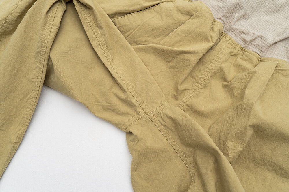 거싯(gusset)이 없는 바지입니다. 가랑이 부분에 시접이 두껍게 몰리는것을 방지하기 위해 위 사진과 같이 앞 중심선이 교차하여 맞물리지 않게 패턴을 적용하였고, 튼튼한 바텍 봉재를 추가하였습니다.